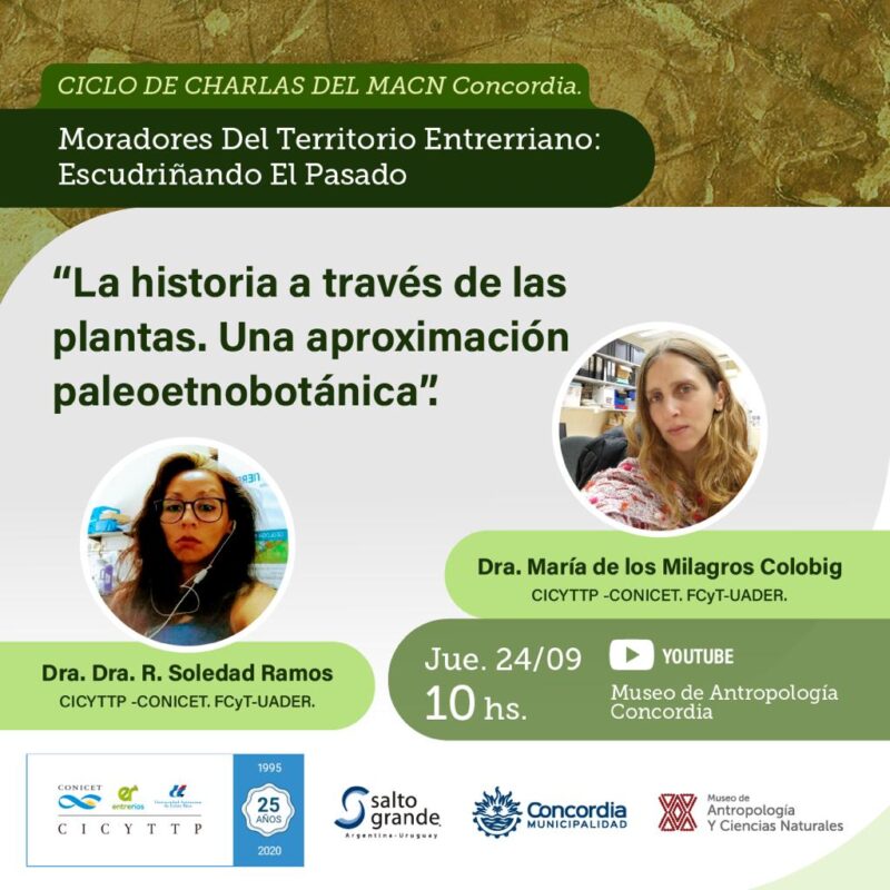 El jueves 24 la charla se refiere a “ LA HISTORIA A TRAVÉS DE LAS PLANTAS. UNA APROXIMACIÓN PALEOETNOBOTÁNICA” y estará a cargo de la Dra. Dra. R. Soledad Ramos. CONICET –UADER y la Dra. Dra. María de los Milagros Colobig. CICYTTP-CONICET –UADER -Pcia Entre Ríos.