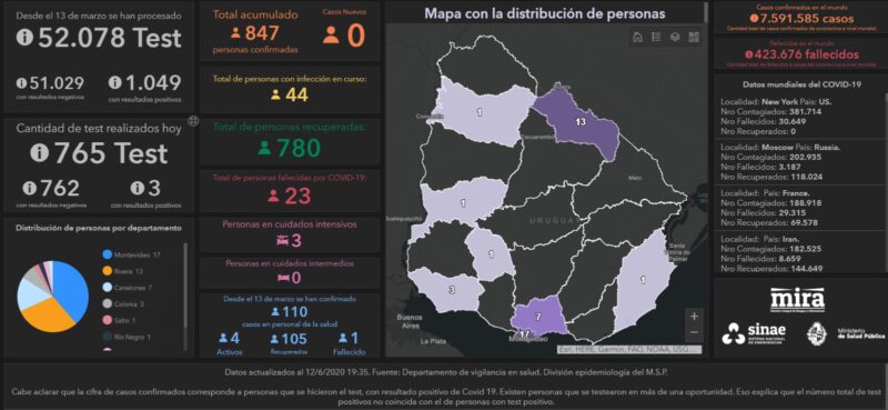 Este viernes 12 se procesaron 765 análisis de COVID-19, con 762 resultados negativos. Los 3 positivos restantes corresponden a personas con seguimiento epidemiológico, que ya se habían realizado pruebas con resultados similares. Eso explica que, a pesar de haberse registrado nuevos test positivos, no haya casos activos nuevos. Actualmente, hay 44 personas cursando la enfermedad en ocho departamentos del país.