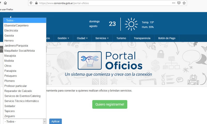 Ingresando al sitio web de la Municipalidad www.concordia.gob.ar se encuentra el link directo al Portal Oficios, que ofrece un listado de carpinteros, albañiles, electricistas, gasistas, modistas, profesores particulares, entre otras actividades. De cada uno se ofrece la información de referencia y las formas de contacto (ya sea a través de las redes sociales o por teléfono).