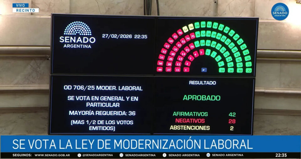 Con una mayoría cómoda que construyó el oficialismo junto a sectores aliados, el Senado convirtió en ley el proyecto de reforma laboral luego de una jornada de protestas en las cercanías del Congreso.