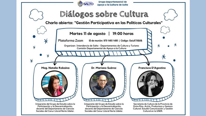 Promoviendo la discusión y el intercambio sobre diferentes aspectos que hacen a las políticas culturales departamentales y regionales, el próximo martes 11 de agosto inicia la serie de charlas abiertas por modalidad virtual denominada “Diálogos sobre Cultura”.