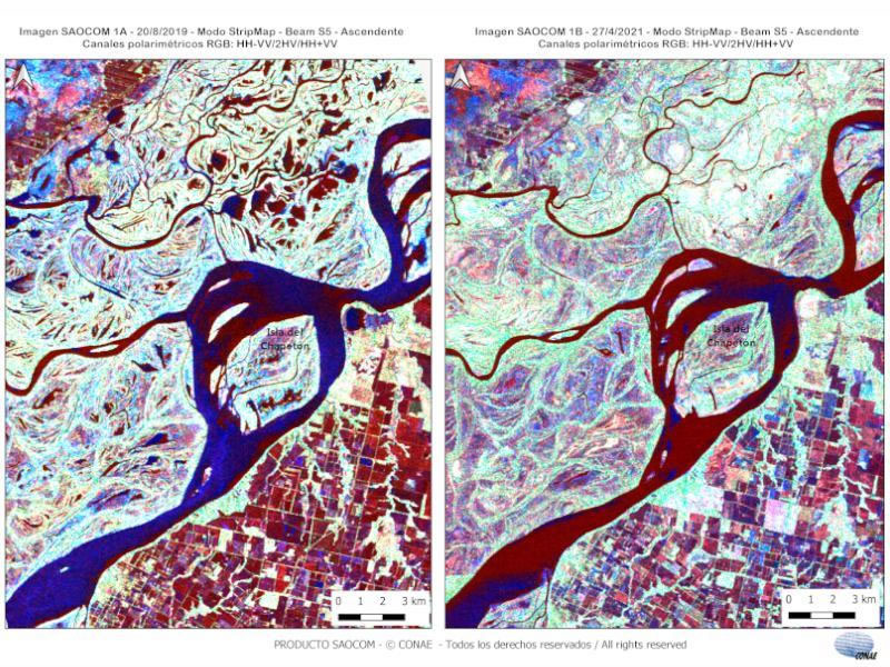 Para evaluar el alcance del descenso, la CONAE comparó imágenes captadas por el satélite SAOCOM 1A en 2019 con las proporcionadas por el SAOCOM 1B en 2021. En las fotografías, la baja se manifiesta en el color marrón de las aguas. Asimismo, se notan bancos de arena y el crecimiento en territorio de las islas.