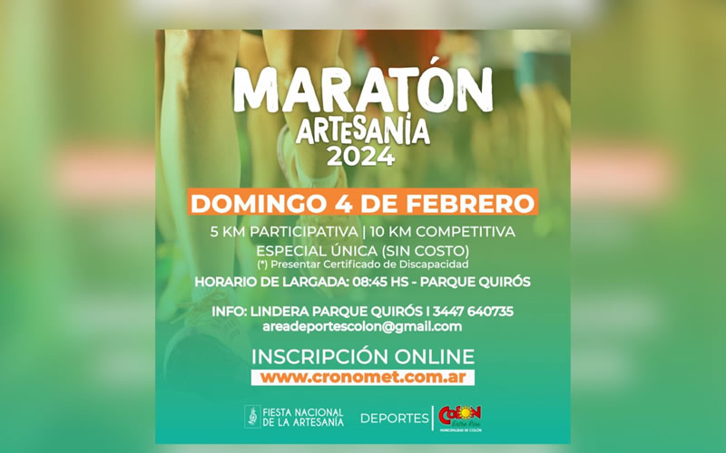 En el marco de la 39° edición de la Fiesta Nacional de la Artesanía, tendrá lugar la Maratón que se llevará a cabo el domingo 4 de febrero a las 8:45 hs. en el Parque Quirós.
