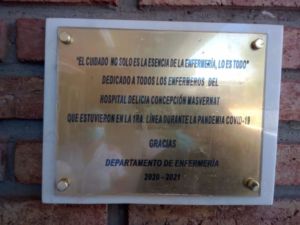 La placa, expresa la siguiente frase, «El cuidado no solo es la esencia de la enfermería, lo es todo». Dedicado a todos los enfermeros del Hospital Delicia Concepción Masvernat, que estuvieron en la primera línea durante la pandemia por covid-19. Gracias Departamento de enfermería.