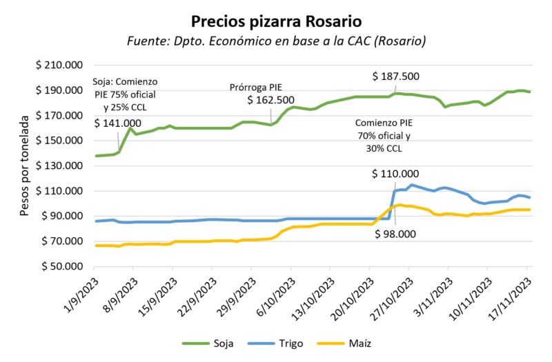 El Programa de Incremento Exportador (PIE), conocido popularmente como “dólar soja” o “dólar agro”, ha sido implementado en varias ocasiones. Las primeras dos etapas abarcaron únicamente la soja, para luego incorporar otros cultivos como las economías regionales. El maíz se sumó a finales de julio del año en curso y, finalmente el 23 de octubre, mediante el Decreto 549/2023, se extendió el programa a todas las exportaciones. La paridad resultante se basa en el tipo de cambio mayorista en un 70%, y el 30% restante se determina a través del mercado financiero (CCL).