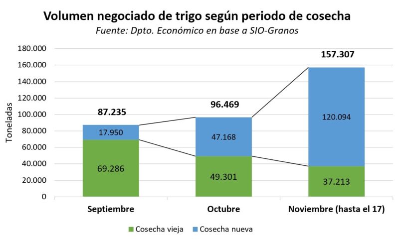 En lo que va del presente mes, la mayor parte de las negociaciones han estado impulsadas por el trigo de la nueva cosecha, representando más del 76% de las operaciones. Esto contrasta con el 24% restante, que pertenece a la cosecha anterior, destacando así la predominancia de la nueva cosecha en las transacciones comerciales de la provincia.
