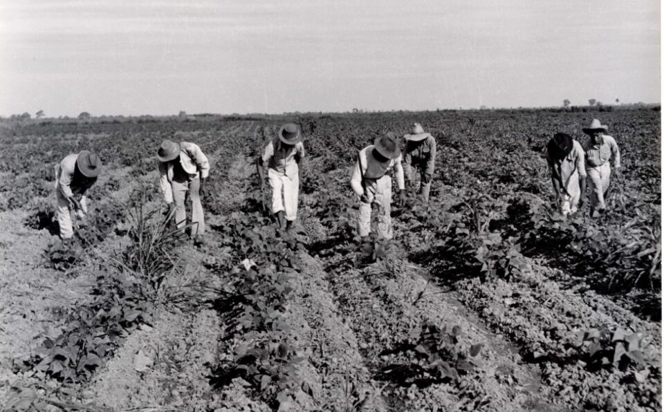 - contrarreforma agraria en marcha, expulsión o ahogo de campesinos, despoblando campos, formando unidades de producción agraria o agropecuaria cada vez mayores e industrializantes (borrando diferencias entre la elaboración de ropas o vajilla, por ejemplo, con la crianza de patos y plantas),