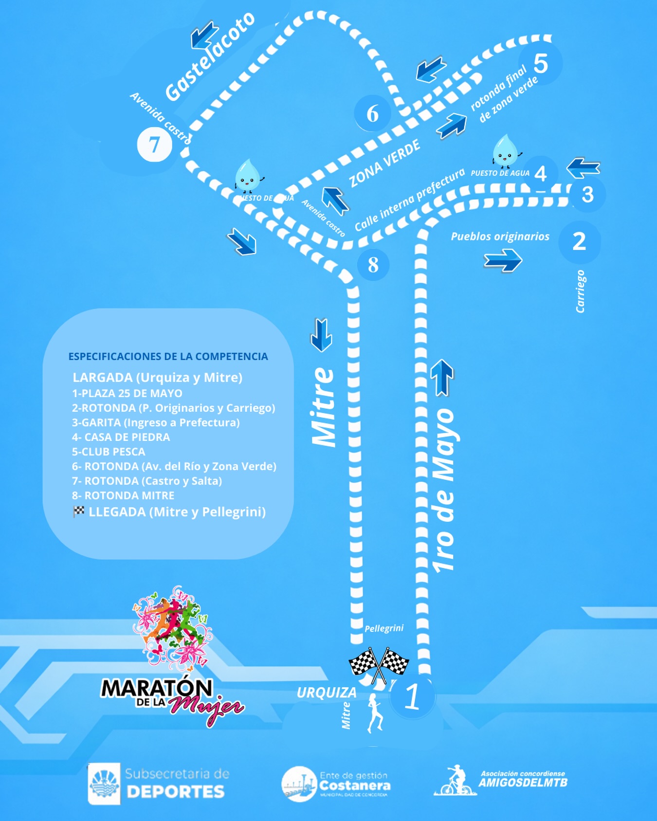 Luego, las corredoras girarán hacia Pueblos Originarios hasta la rotonda de calle Carriego. El trayecto continuará por la calle interna de Prefectura, avenida Castro y Zona Verde, donde estará ubicado el puesto de hidratación.
