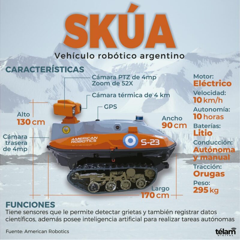 Bautizado «Skúa» como el ave antártica, este Vehículo Terrestre No Tripulado (UGV, por sus siglas en inglés) está equipado con sensores que le permiten detectar grietas cubiertas por la nieve y trazar caminos seguros, sus sensores meteorológicos colaboran con el registro de datos científicos de diversas investigaciones y además se lo dotó de una inteligencia artificial que le permitiría llevar adelante de forma autónoma tareas como el relevamiento de las poblaciones de pingüinos.
