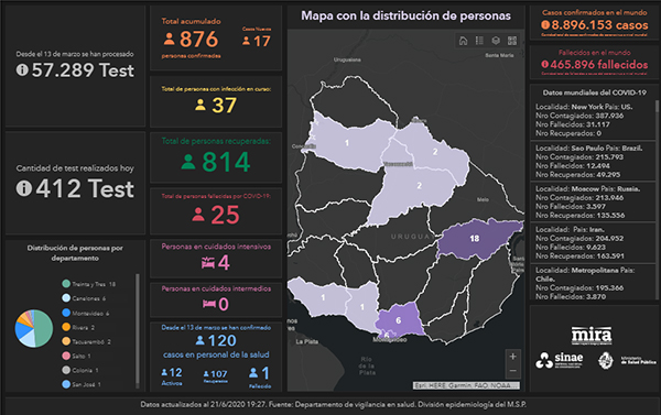 El informe del Sistema Nacional de Emergencias (Sinae) correspondiente al 21 de junio indica que, de los 412 análisis realizados en la jornada, 17 resultaron positivos con COVID-19. En estos momentos hay 37 personas afectadas por la enfermedad, 814 se recuperaron y 25 fallecieron. Los casos activos se distribuyen en ocho departamentos: Canelones, Colonia, Montevideo, Rivera, Treinta y Tres, San José, Salto y Tacuarembó.