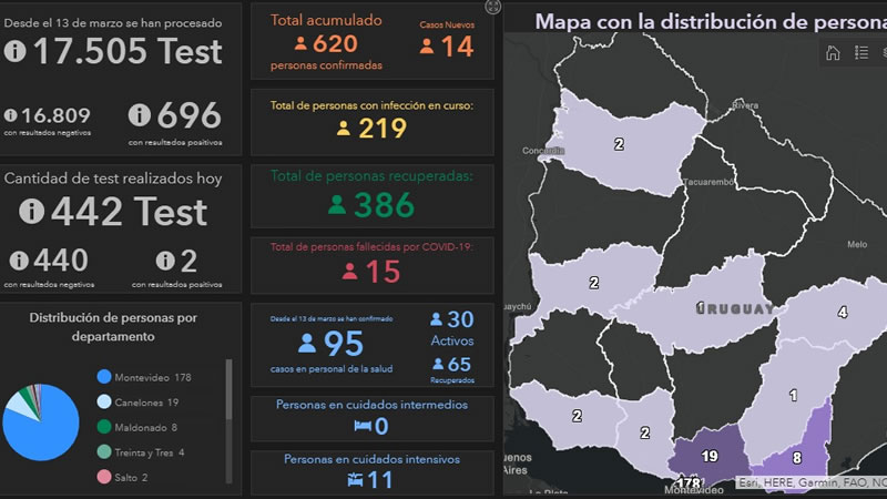 La última actualización del Sistema Nacional de Emergencias (Sinae) contabiliza 620 casos de COVID-19 en el país; de los 442 análisis realizados en esta jornada, en dos se constató la presencia del virus. Al momento, los departamentos con casos confirmados son Canelones, Colonia, Durazno, Lavalleja, Maldonado, Montevideo, Río Negro, Salto, San José y Treinta y Tres.