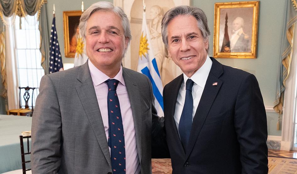 Este martes 12, el canciller Francisco Bustillo se reunió con el secretario de Estado, Antony Blinken, en el marco de su visita oficial a los Estados Unidos de América. Ambos jerarcas resaltaron el excelente momento de las relaciones bilaterales y las visiones compartidas sobre los principales asuntos globales. La agenda incluyó encuentros con el secretario general de la OEA, el subsecretario para Asuntos del Hemisferio Occidental y la subsecretaria de Agricultura.