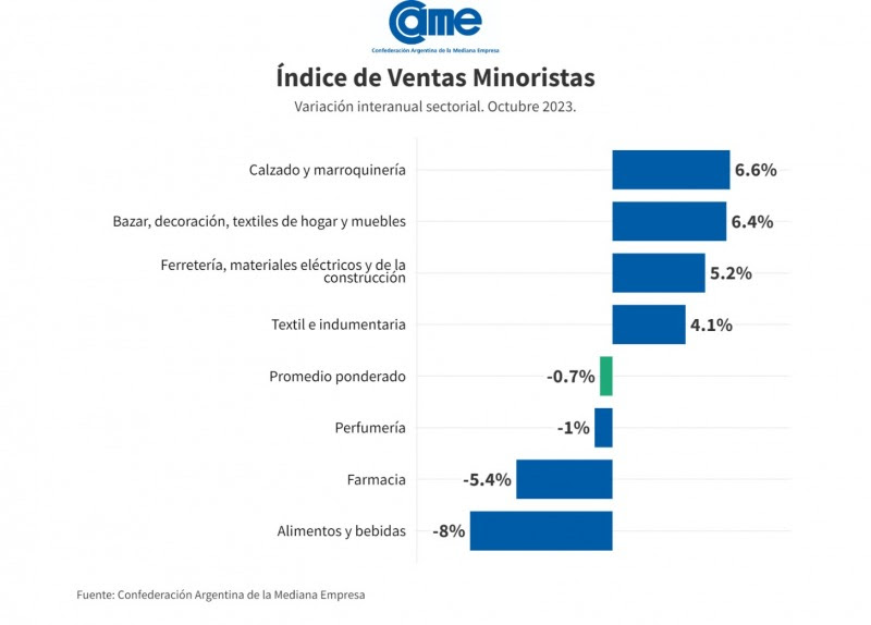 Así surge del Índice de Ventas Minoristas Pymes de la Confederación Argentina de la Mediana Empresa (CAME), elaborado en base a un relevamiento mensual entre 1.315 comercios minoristas del país, realizado del 1 al 3 de noviembre.