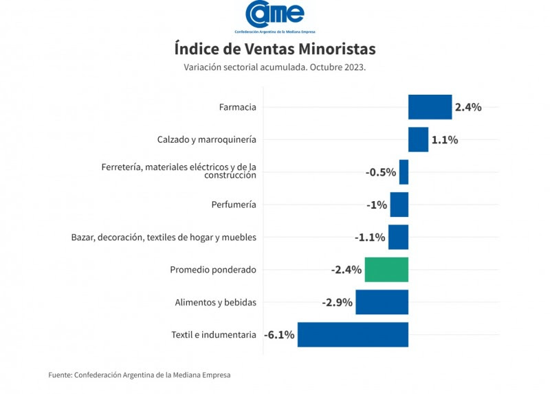 Según el informe elaborado por la Confederación Argentina de la Mediana Empresa (CAME), en los primeros diez meses del año el comercio minorista argentino acumula un descenso del 2,4% interanual.
