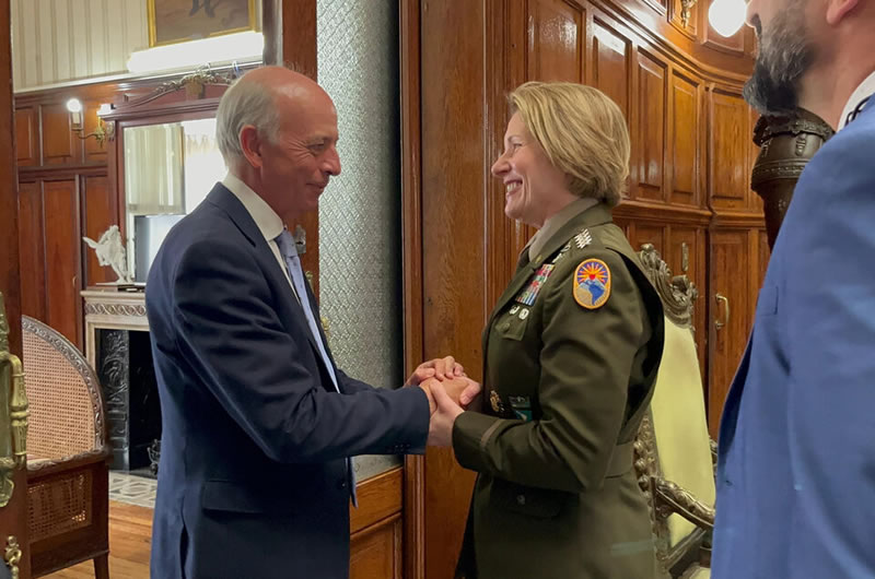 El ministro de Defensa Nacional de Uruguay, Javier García, saluda a la comandante del Comando Sur de los Estados Unidos, Laura Richardson.